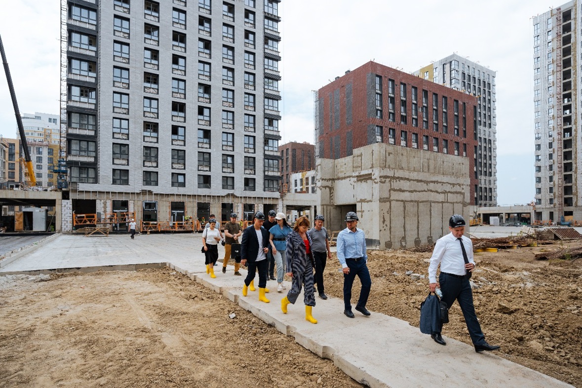 Делегация «Сбера»* осмотрела офис продаж и новый интерактивный макет проекта. Также гости прошлись по строительной площадке: им показали жилые корпуса первой очереди, будущие дворы, подземные паркинги, коммерческие помещения, школу и детские сады. Отдельно продемонстрировали шоурумы квартир и подъездов.