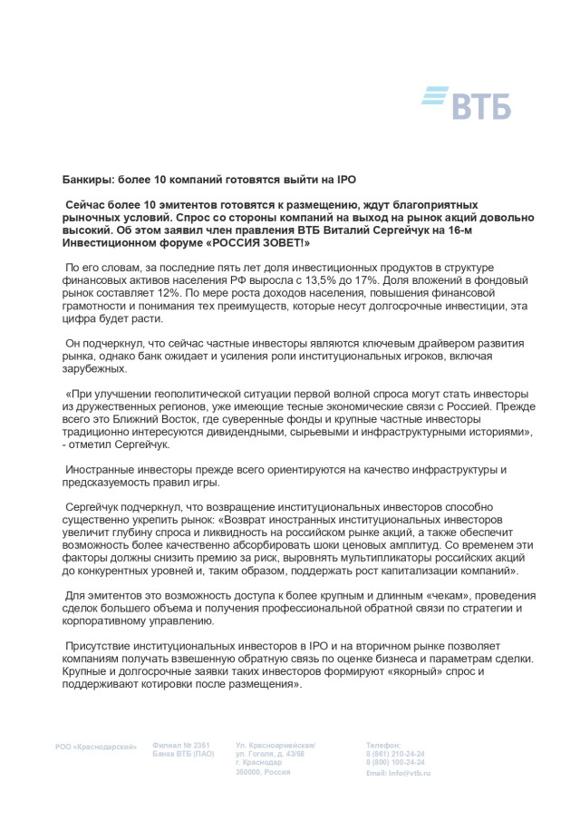 Спрос со стороны компаний на выход на рынок акций довольно высокий. Об этом заявил член правления ВТБ Виталий Сергейчук на 16-м Инвестиционном форуме «Россия зовет!».